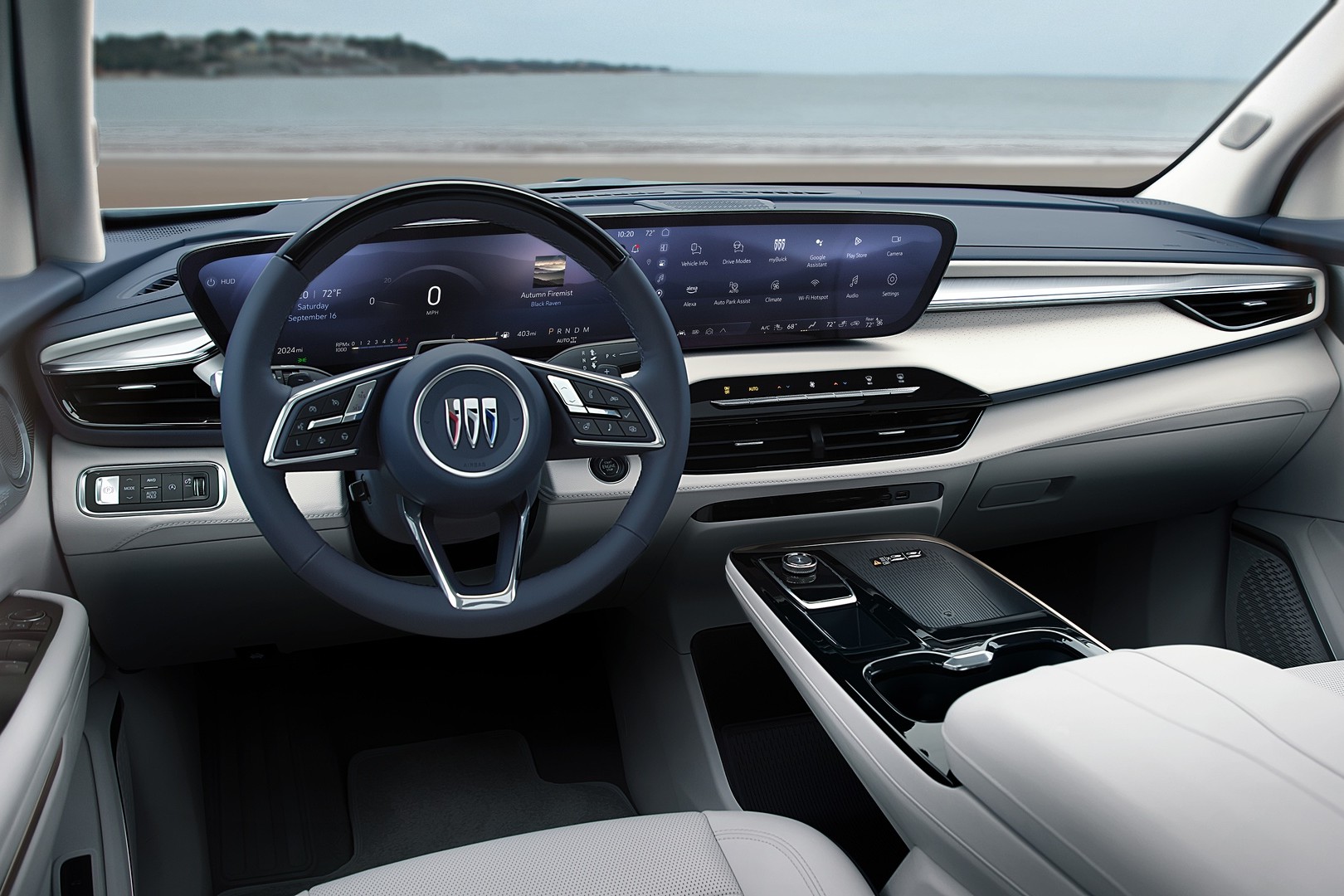 The Enclave's interior highlights Buick's commitment to passenger comfort and adaptability. The standard seating for seven includes second-row captain's chairs with armrests and a 60/40 split-folding bench in the third row. High-quality materials throughout the cabin give a luxurious feel, with options such as leatherette, perforated leatherette, and quilted perforated leather seats. The tri-zone automatic climate control maintains a comfortable environment for all occupants, while heated front seats and an optional heated steering wheel add warmth during cold weather.